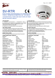 SF-ETD Rilevatore di temperatura analogico indirizzato a soglia fissa. Programmazione: indirizzo univoco per le centrali SF-EPU, SF-EPD, SF-EPQ; soglia d’intervento 62° tempo di attivazione. Segnalazione a led: stato, anomalia, manutenzione. Uscita 14 mA Led remoto. Test magnetico: prova collegamenti. Installazione a soffitto, altezza dal pavimento inferiore a 8 metri, a 6 metri copertura da 30 a 50 m². Alimentazione dal loop 20/28 V. Assorbimento 90 µA. Contenitore con base ABS. Protezione IP20, Certificato EN 54-5 CPR, EN54-17. Dimensioni compresa base Ø106XH59 mm. Peso 150 gr. SV-RTC Rilevatore di temperatura convenzionale, soglia fissa 62°, o prefissata. Compatibile con le centrali antincendio convenzionali. che rilevano l’allarme per assorbimento; riposo 50 µA allarme 25 mA. Le rimanenti caratteristiche sono come SF-ETD SV-RTR Rivelatore temperatura. soglia fissa e prefissata. Alimentazione 12/28 Vcc. Assorbimento in allarme 25 mA. Uscita relè NC, allarme NA, 1 A 28 Vcc. Compatibile con tutte le centrali di allarme. Le rimanenti caratteristiche come SF-ETD |